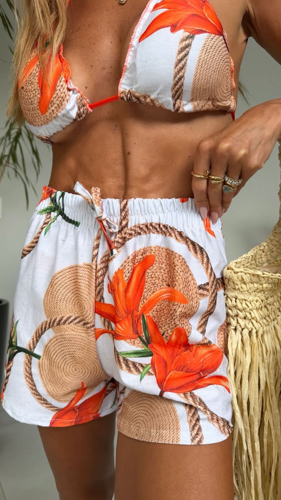 O shorts, terceira peça do conjunto, é confeccionado no mesmo tecido do biquíni e traz modelagem soltinha com cintura ajustável por amarração, oferecendo leveza, conforto e praticidade — ideal para o pós-praia ou para composições estilosas ao longo do dia.
