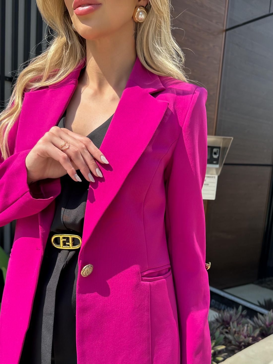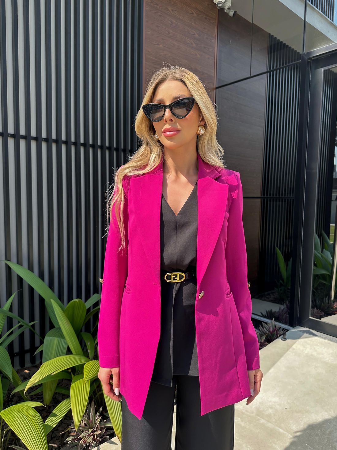 Seu design alongado valoriza a silhueta, enquanto o fechamento com 1 botão dourado adiciona um toque de sofisticação inspirado na estética clássica da alta-costura, remetendo ao estilo icônico Balmain. Totalmente forrado, garante conforto, durabilidade e um vestir refinado.