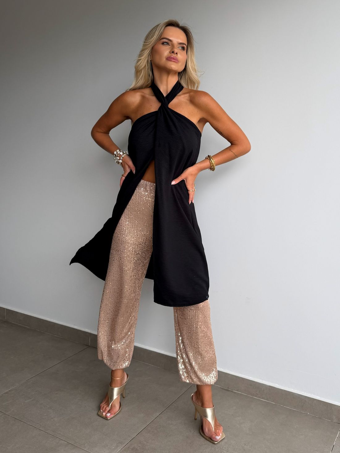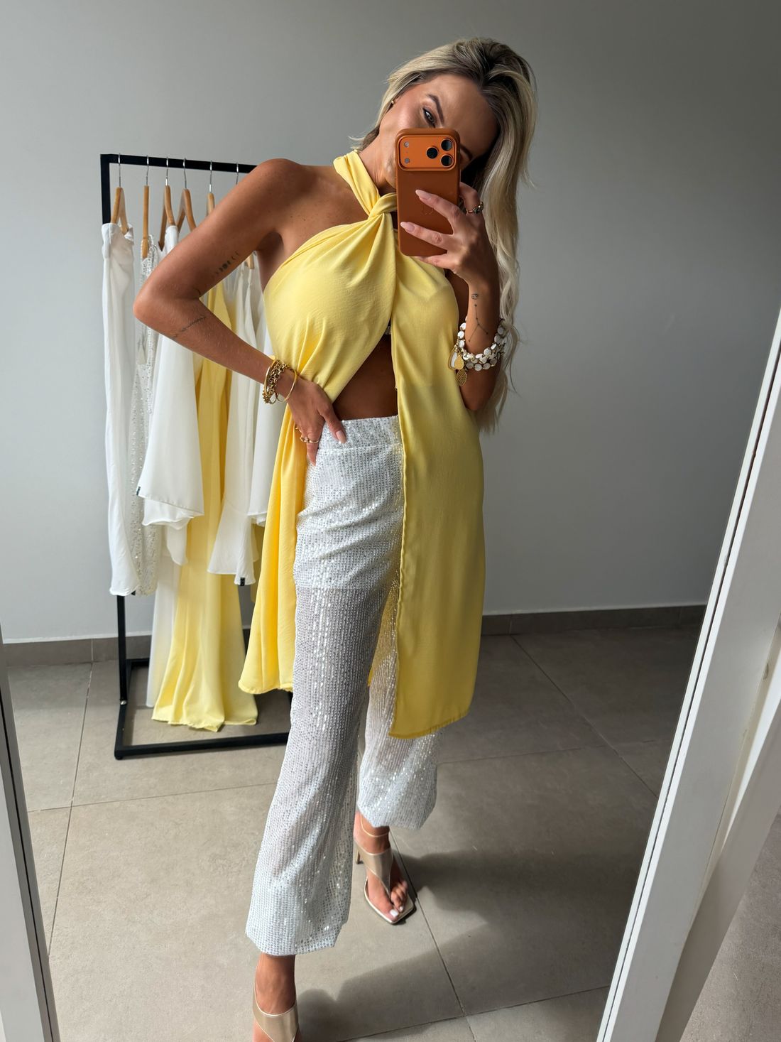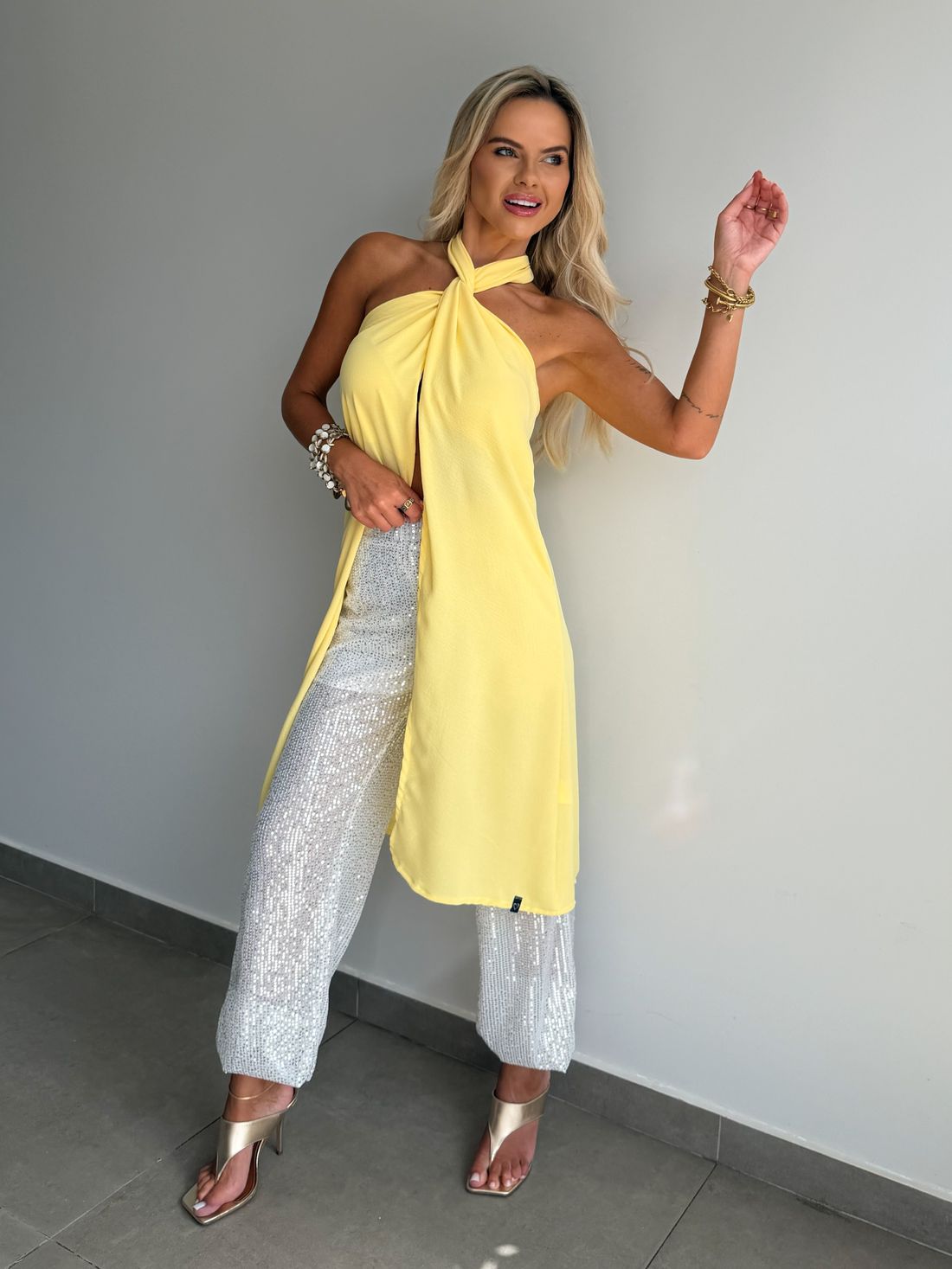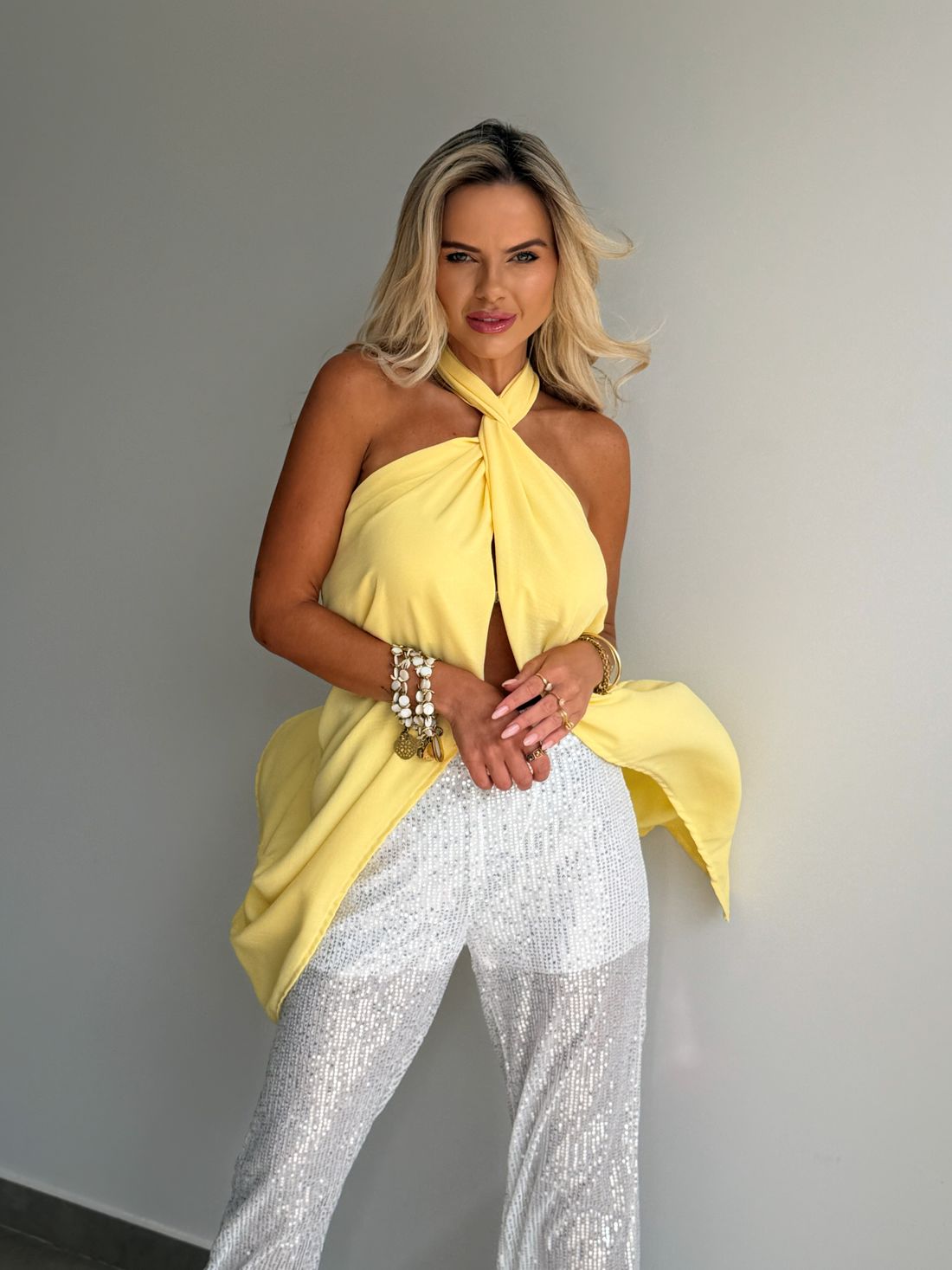 O modelo se destaca pelo design moderno e marcante: a parte frontal conta com duas pontas alongadas, enquanto as alças são transpassadas no pescoço e levadas para trás, criando um visual elegante e atual no busto. As partes frontais permanecem posicionadas à frente, formando o efeito característico da peça e deixando o abdômen levemente à mostra, na medida certa.