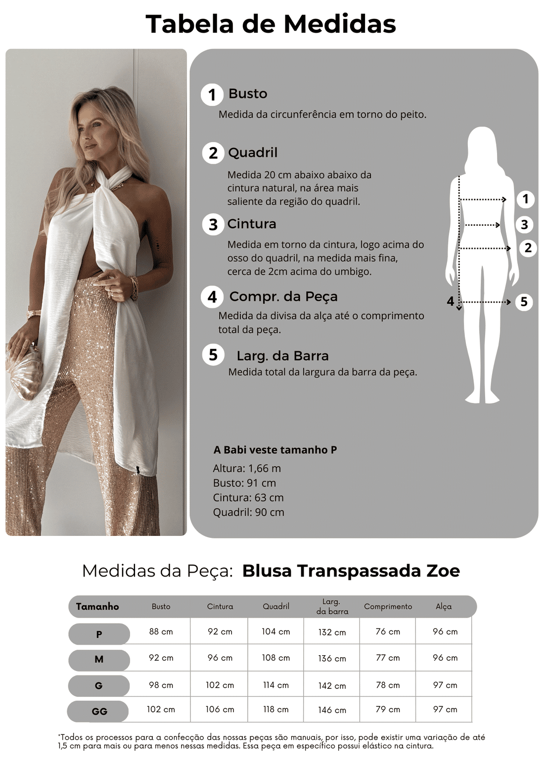 👉 Dica de tamanho: consulte a tabela de medidas. A medida do busto é a principal referência para escolher o tamanho ideal.