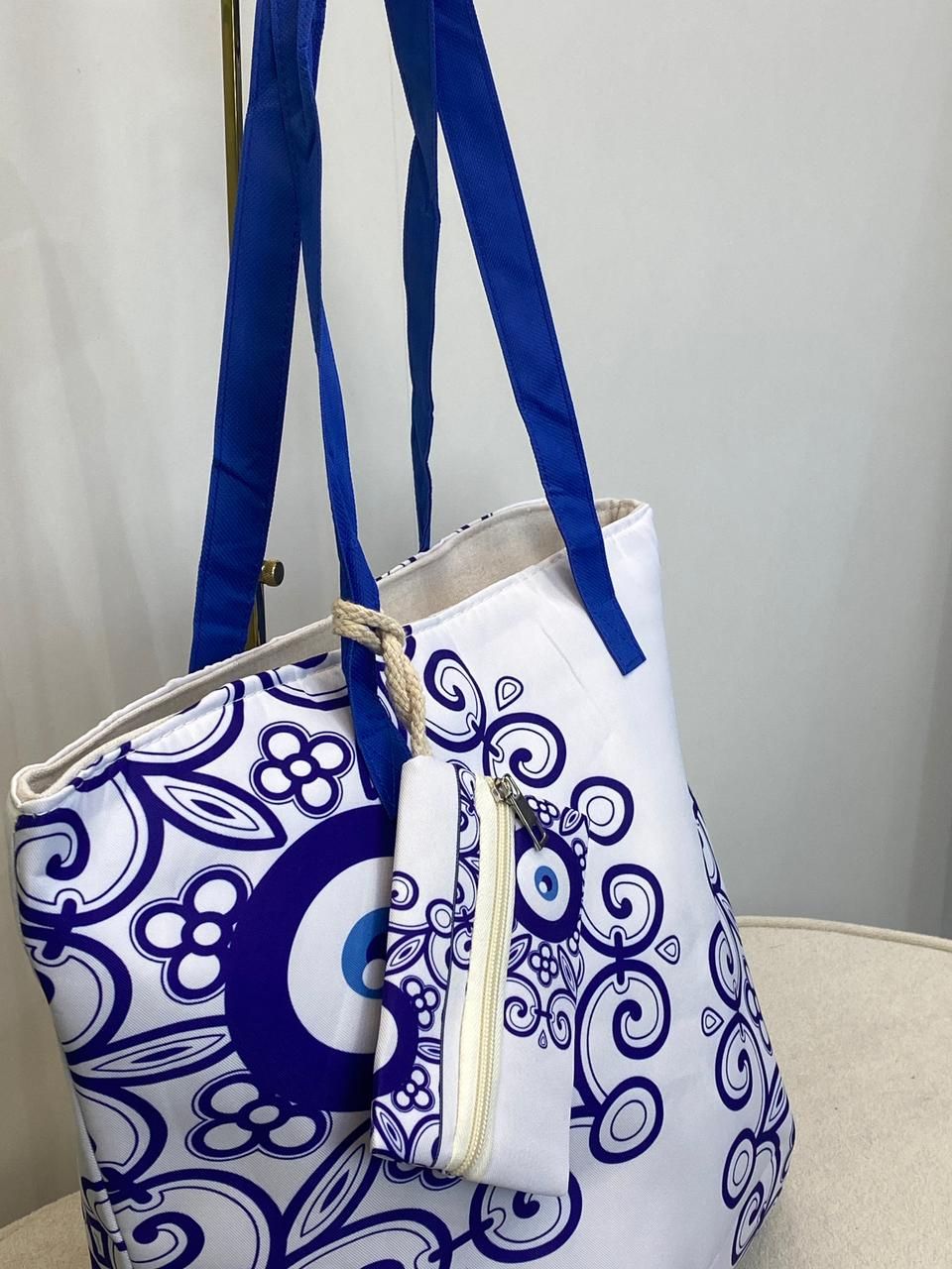 A Bolsa de Praia Olho Grego é a escolha ideal para quem busca estilo, praticidade e um toque de proteção simbólica para os dias de sol. Confeccionada em material resistente com estampa inspirada na cerâmica grega, ela traz o clássico olho grego em destaque, adicionando charme e personalidade ao visual. 🔵✨