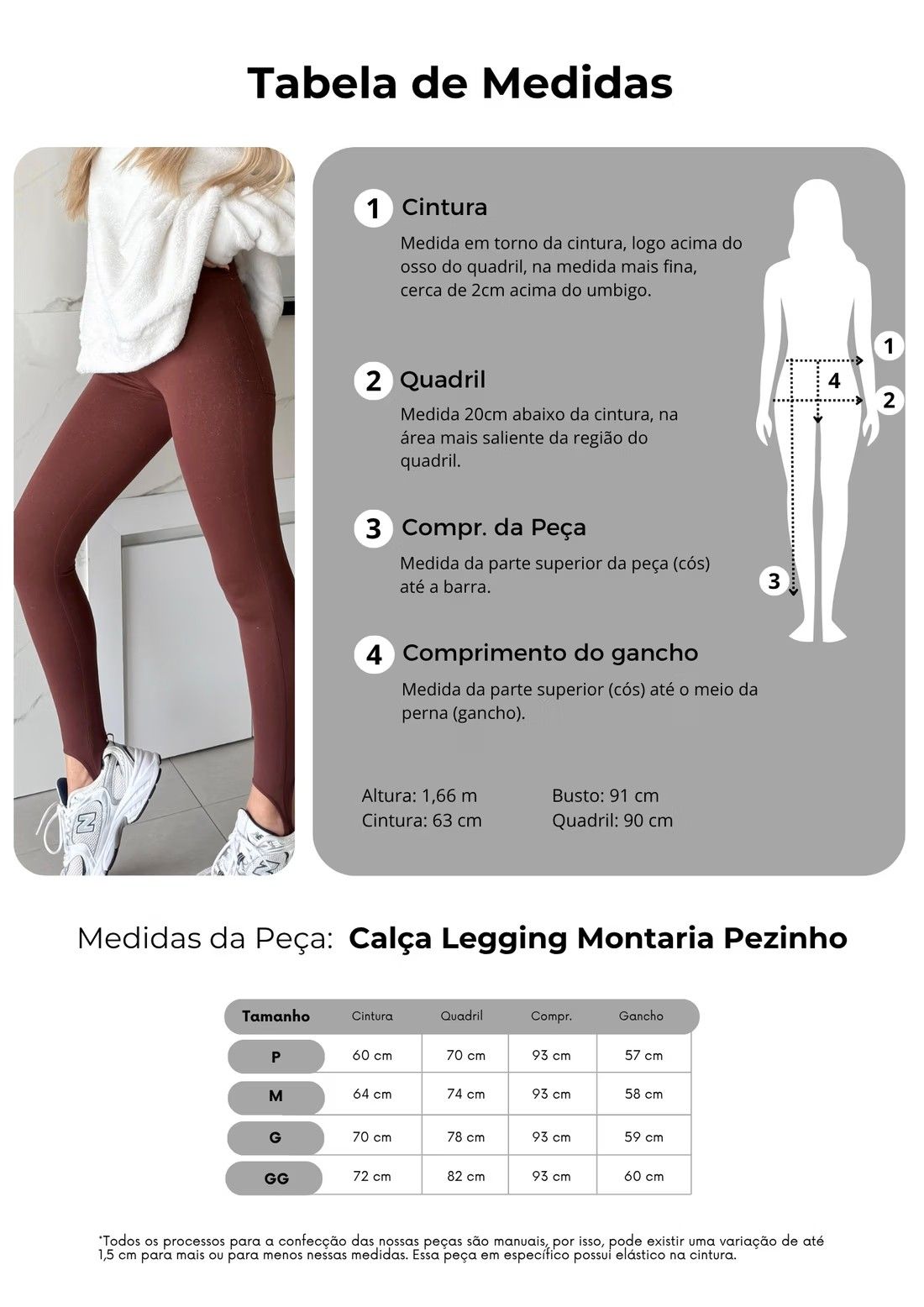 Com modelagem legging, a peça valoriza a silhueta e garante caimento anatômico. Possui dois bolsos traseiros funcionais, que unem praticidade e design. O grande diferencial é o pezinho, que proporciona melhor encaixe, evita que a calça suba ao vestir e adiciona um visual atual e esportivo à produção.