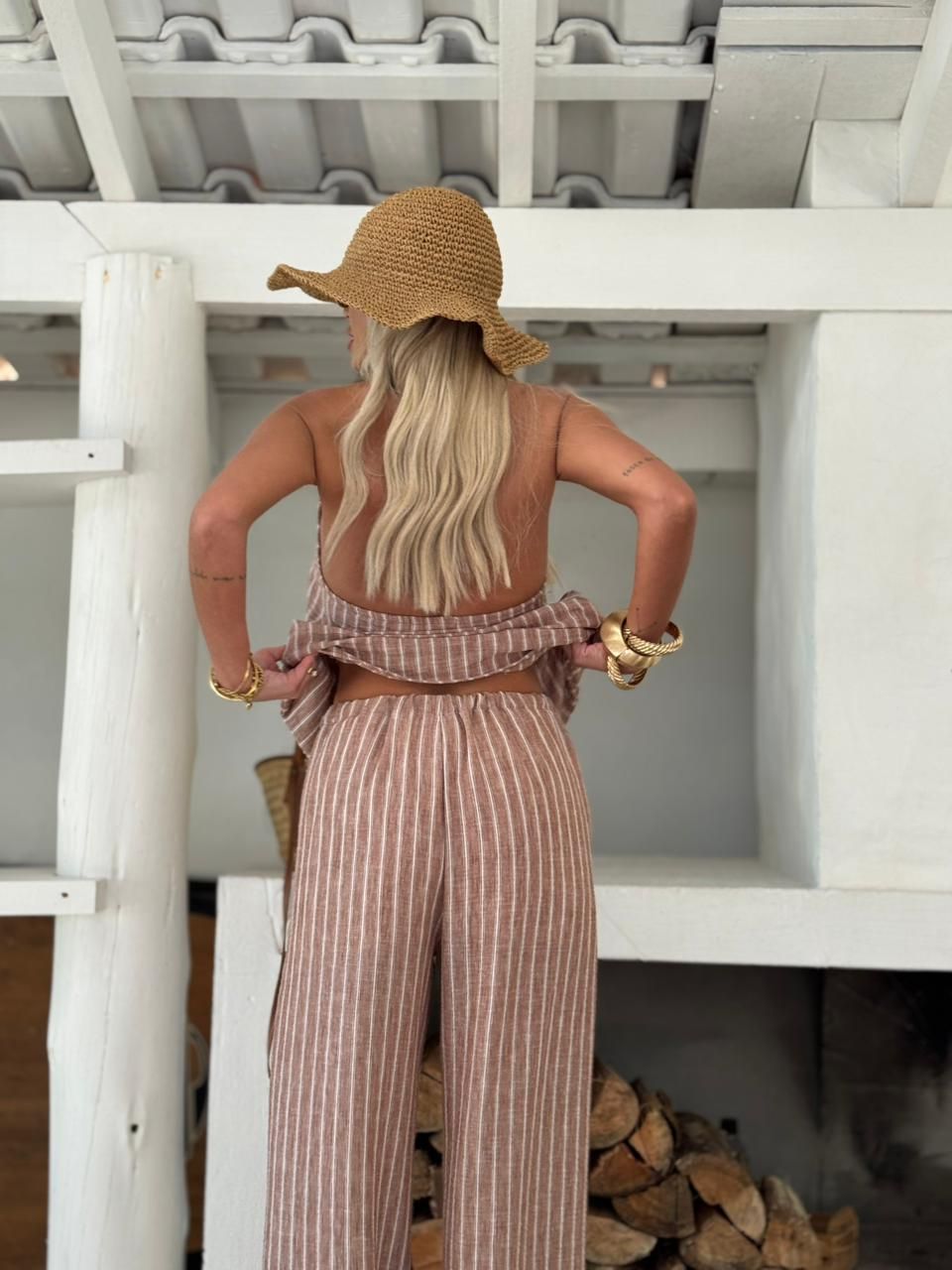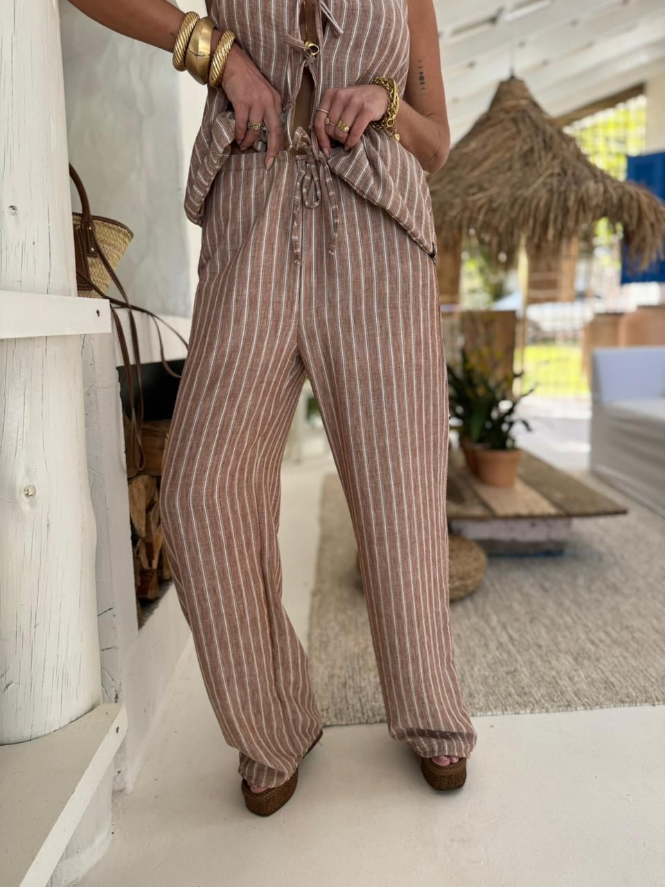 Calça Pantalona Isla é a escolha ideal para quem busca elegância, conforto e um visual alongado e sofisticado. Confeccionada em tecido plano listrado com aspecto de linho, ela possui modelagem ampla, que valoriza a silhueta com leveza e movimento. O modelo conta com cintura alta com amarração, que garante melhor ajuste ao corpo, além de bolsos frontais funcionais e forro até abaixo do quadril, proporcionando conforto e segurança sem transparência. 🔥