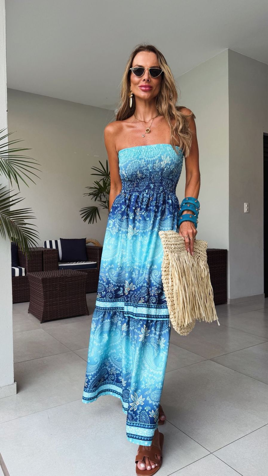 Confeccionado em tecido leve e fresco, o modelo conta com busto em lastex (smock) que se ajusta ao corpo, oferecendo excelente vestibilidade sem bojo. Seu grande diferencial são as alças para amarração, que permitem usar o vestido tanto tomara que caia quanto com amarração nos ombros, garantindo versatilidade e segurança conforme o seu estilo.