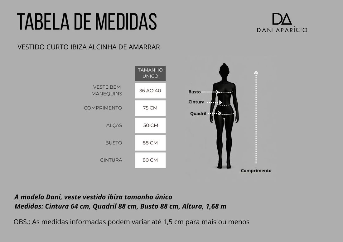Medidas: Altura 1,68 m | Busto 82 cm | Cintura 64 cm | Quadril 88 cm