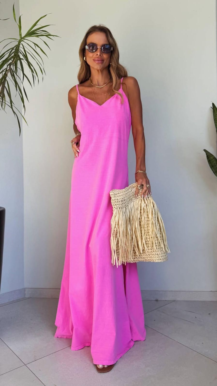 O decote em V valoriza o colo de forma delicada, enquanto as alcinhas finas e o design sem mangas deixam a peça ainda mais leve e arejada. As fendas laterais trazem movimento ao caminhar e adicionam um charme extra ao look.