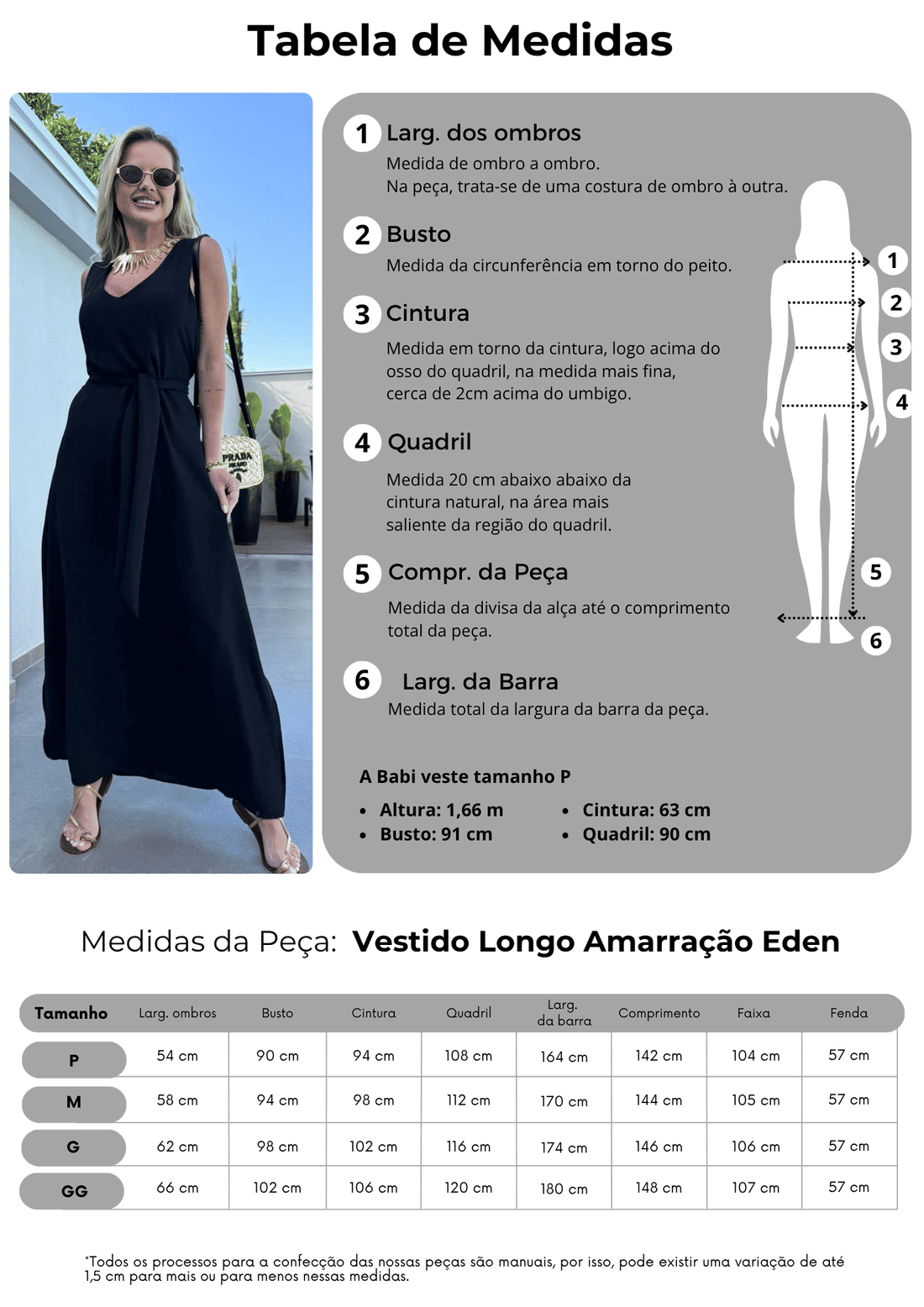 👉 Dica de tamanho: consulte a tabela de medidas. As medidas de busto e cintura são as principais referências para a escolha ideal.