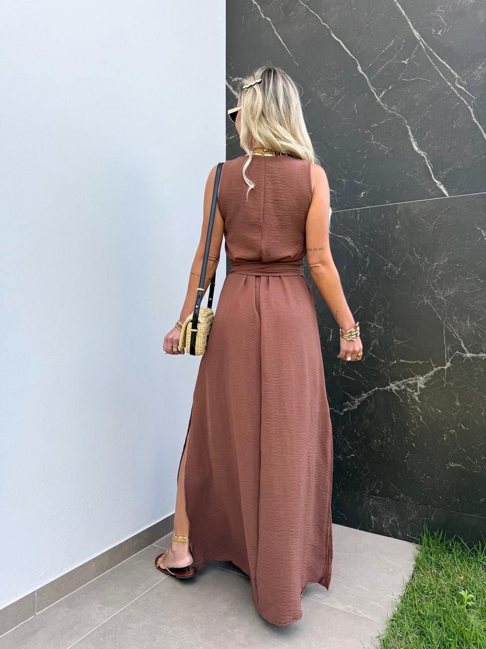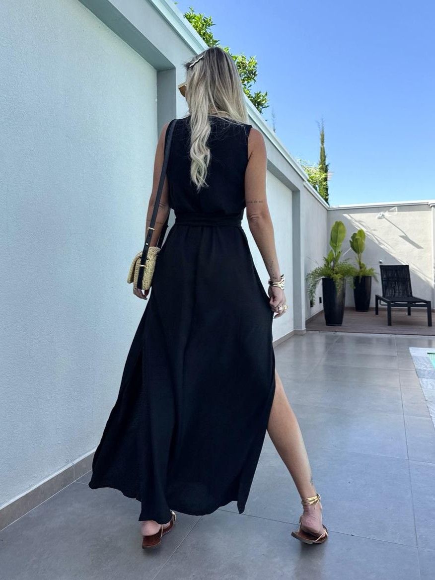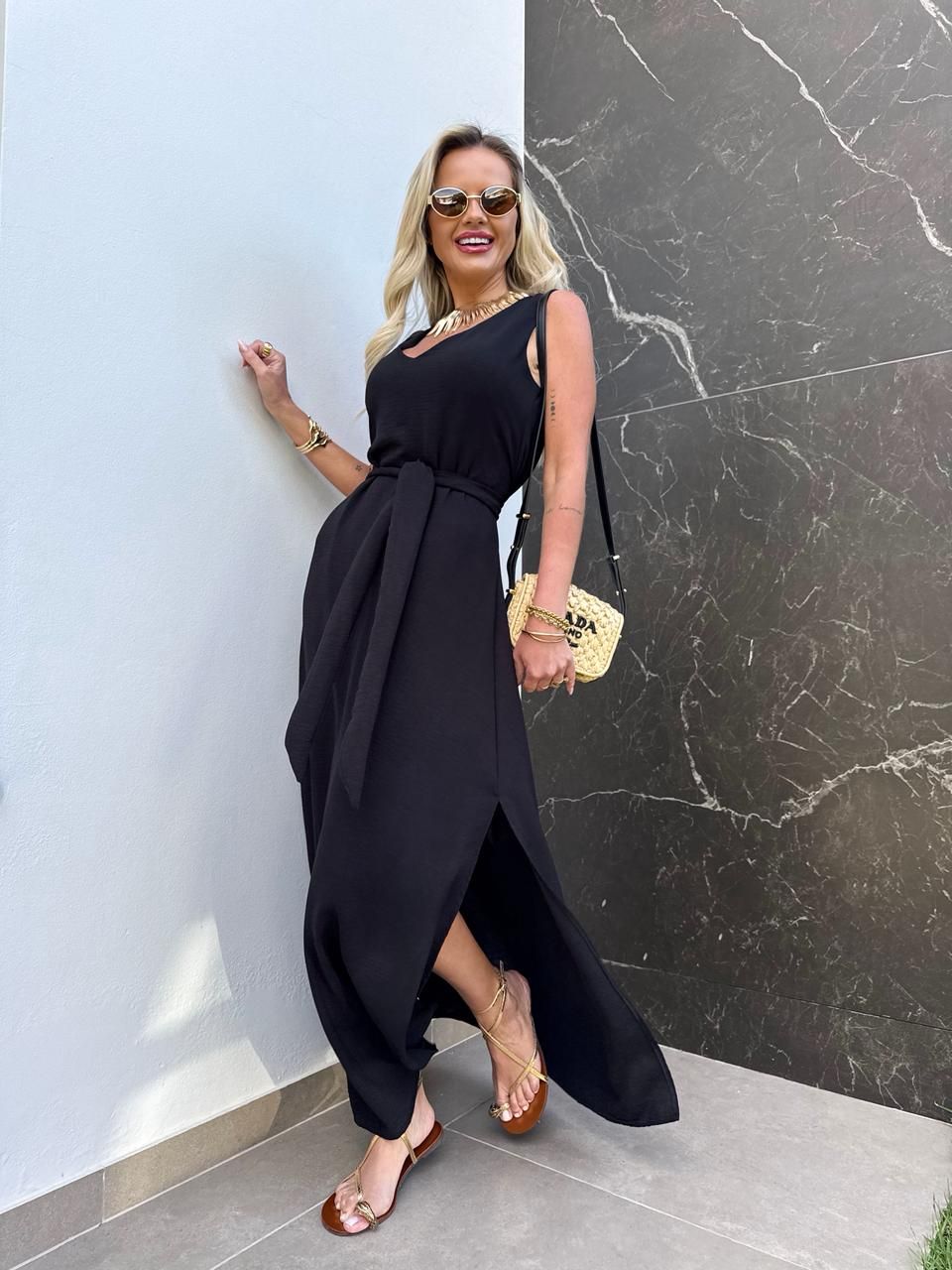 As fendas laterais adicionam movimento ao caminhar e um toque de leveza ao visual. Um vestido versátil, perfeito para ocasiões que pedem conforto sem abrir mão da elegância.