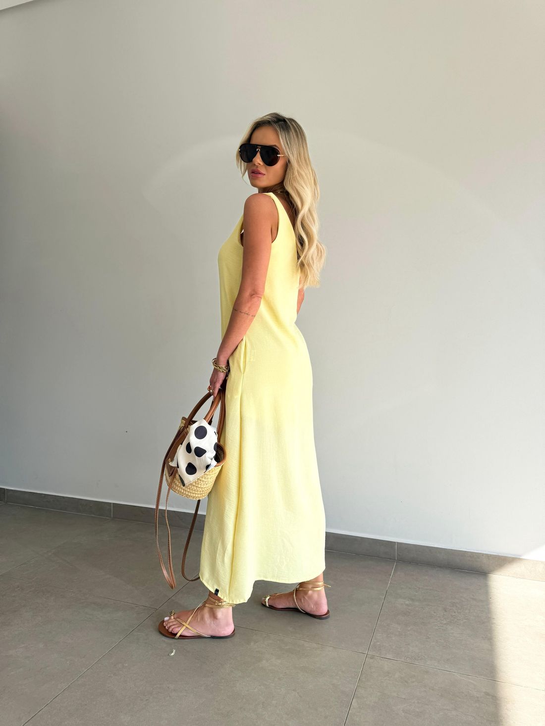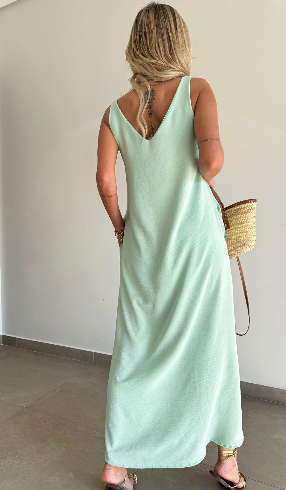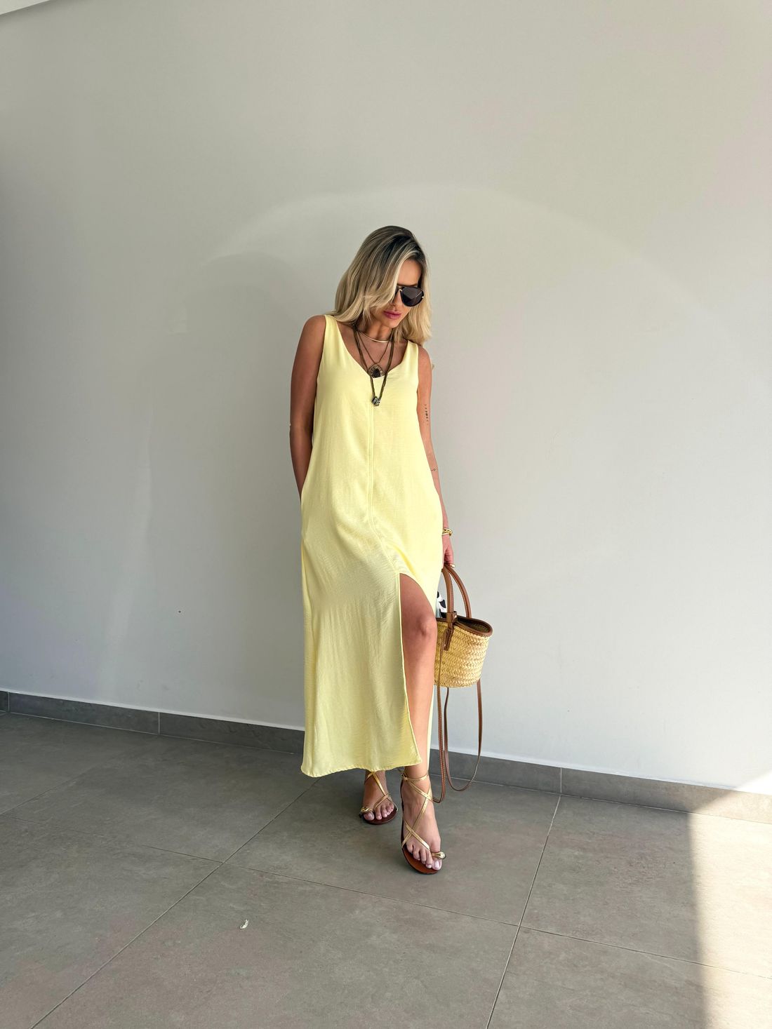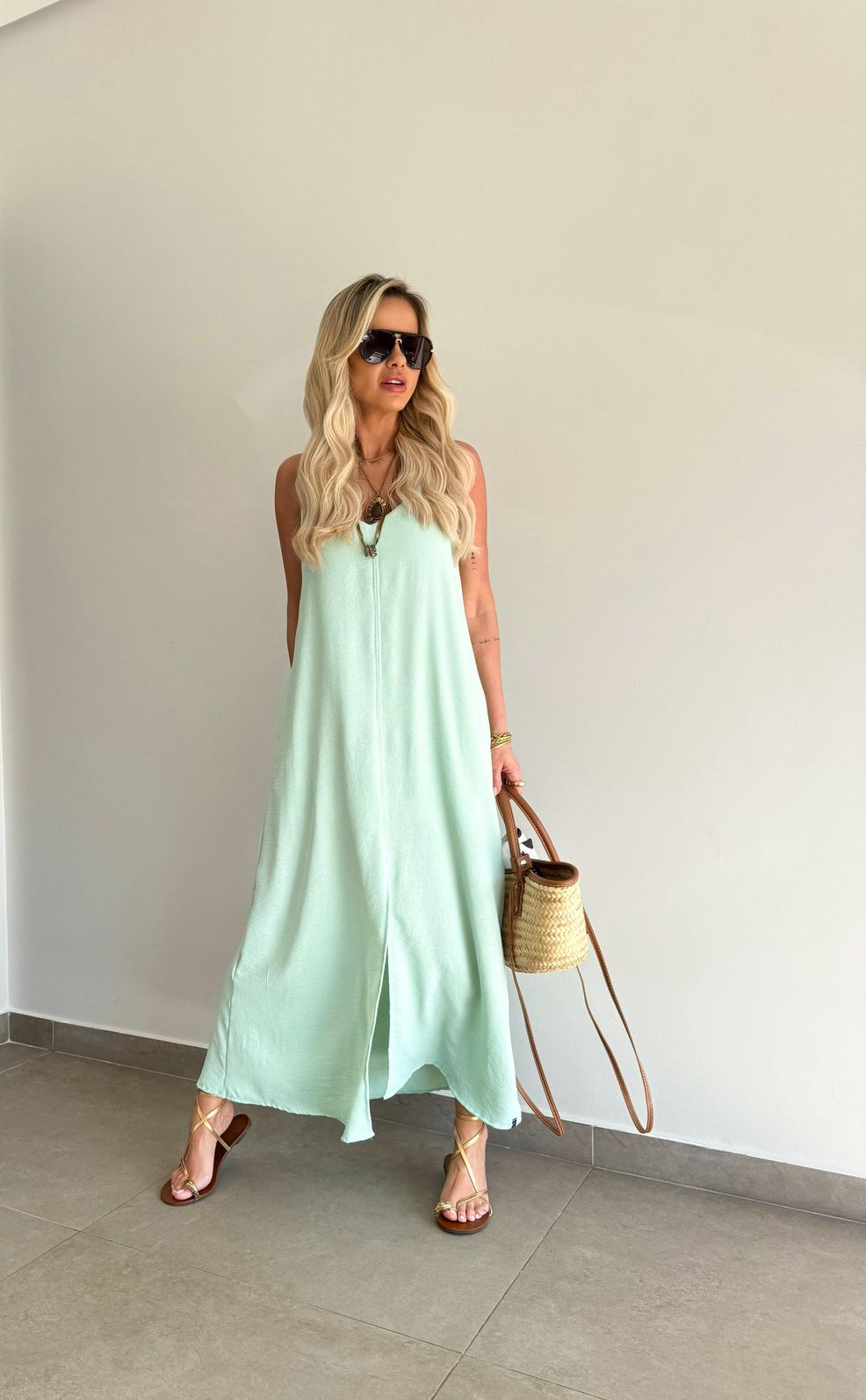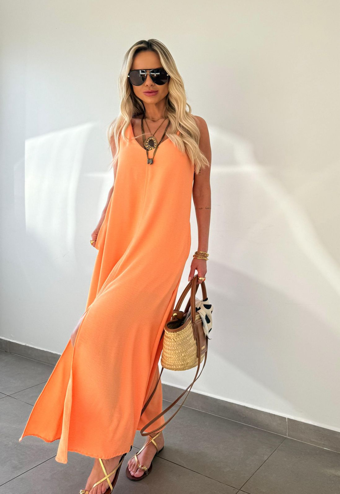 O comprimento midi traz movimento à peça, enquanto a fenda frontal adiciona charme e leveza ao visual. O decote em V valoriza o colo de forma delicada, e as alças mais largas oferecem sustentação e conforto, permitindo o uso com sutiã sem comprometer a estética.