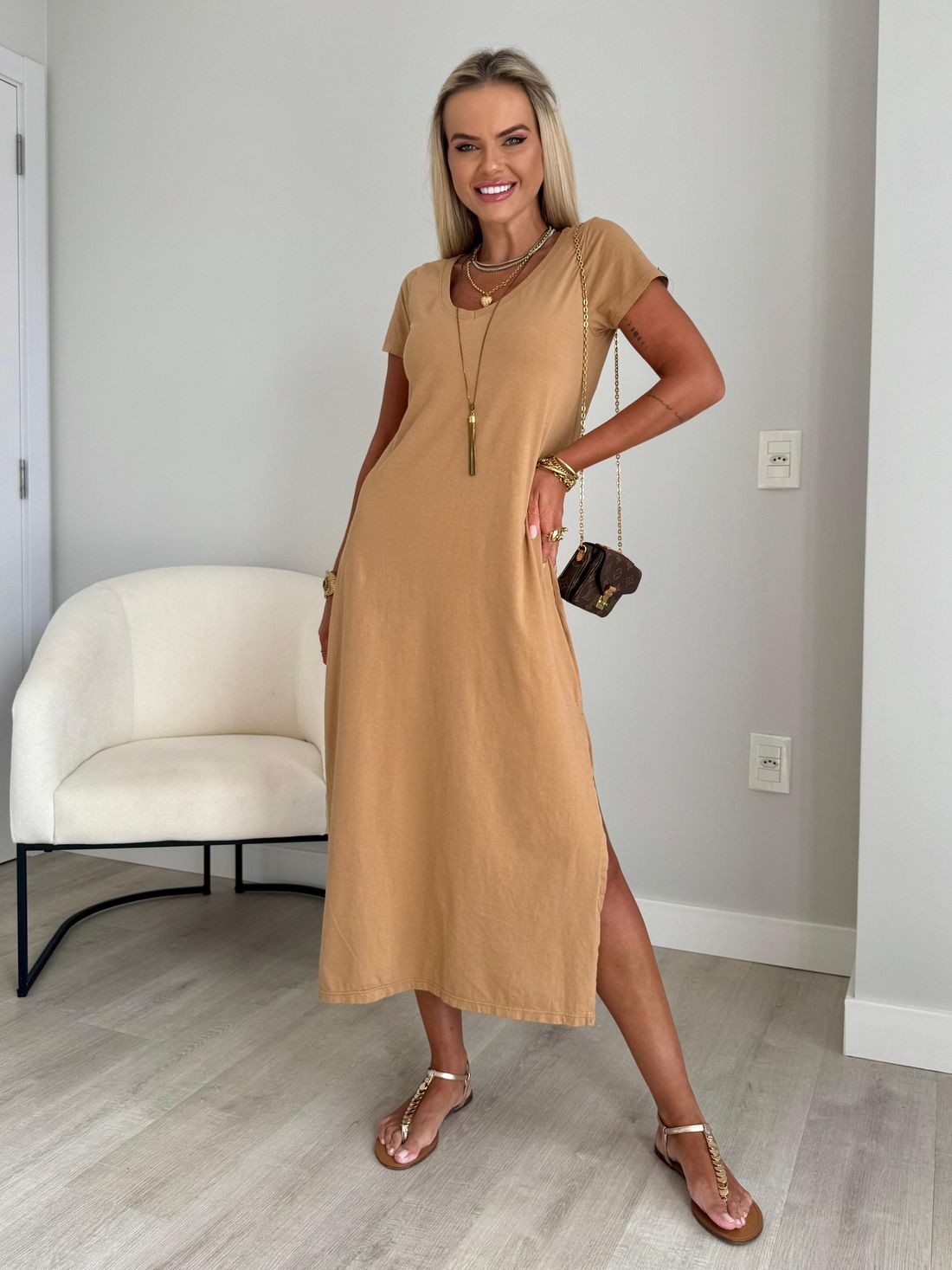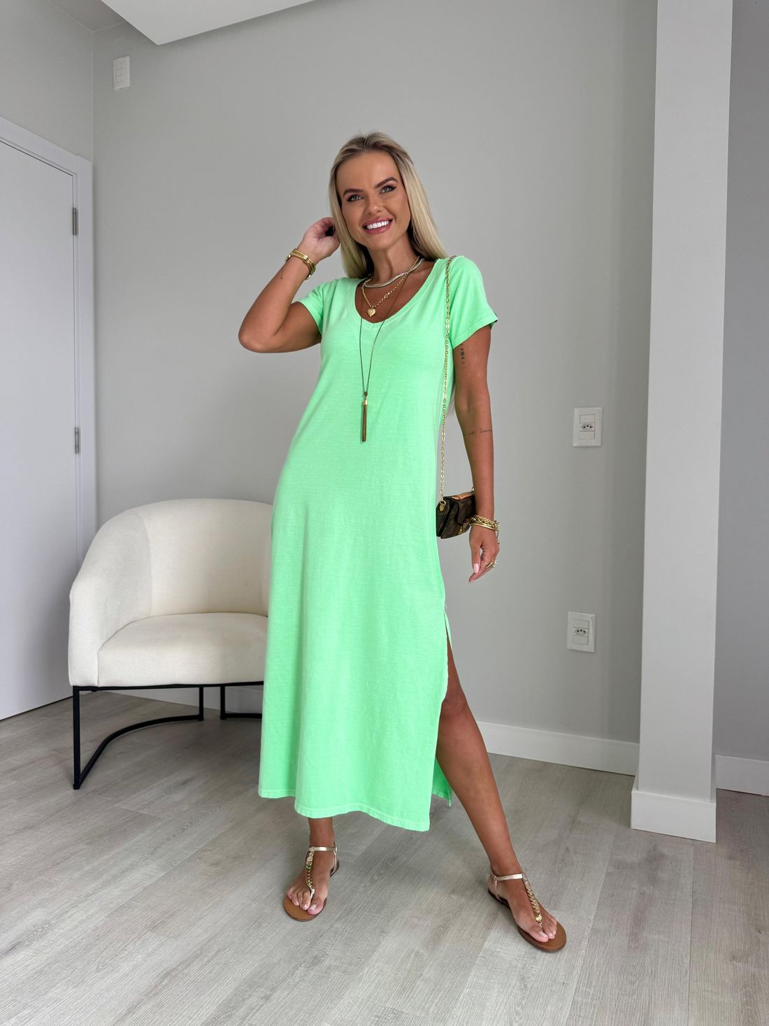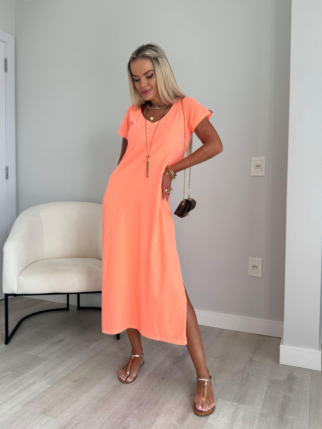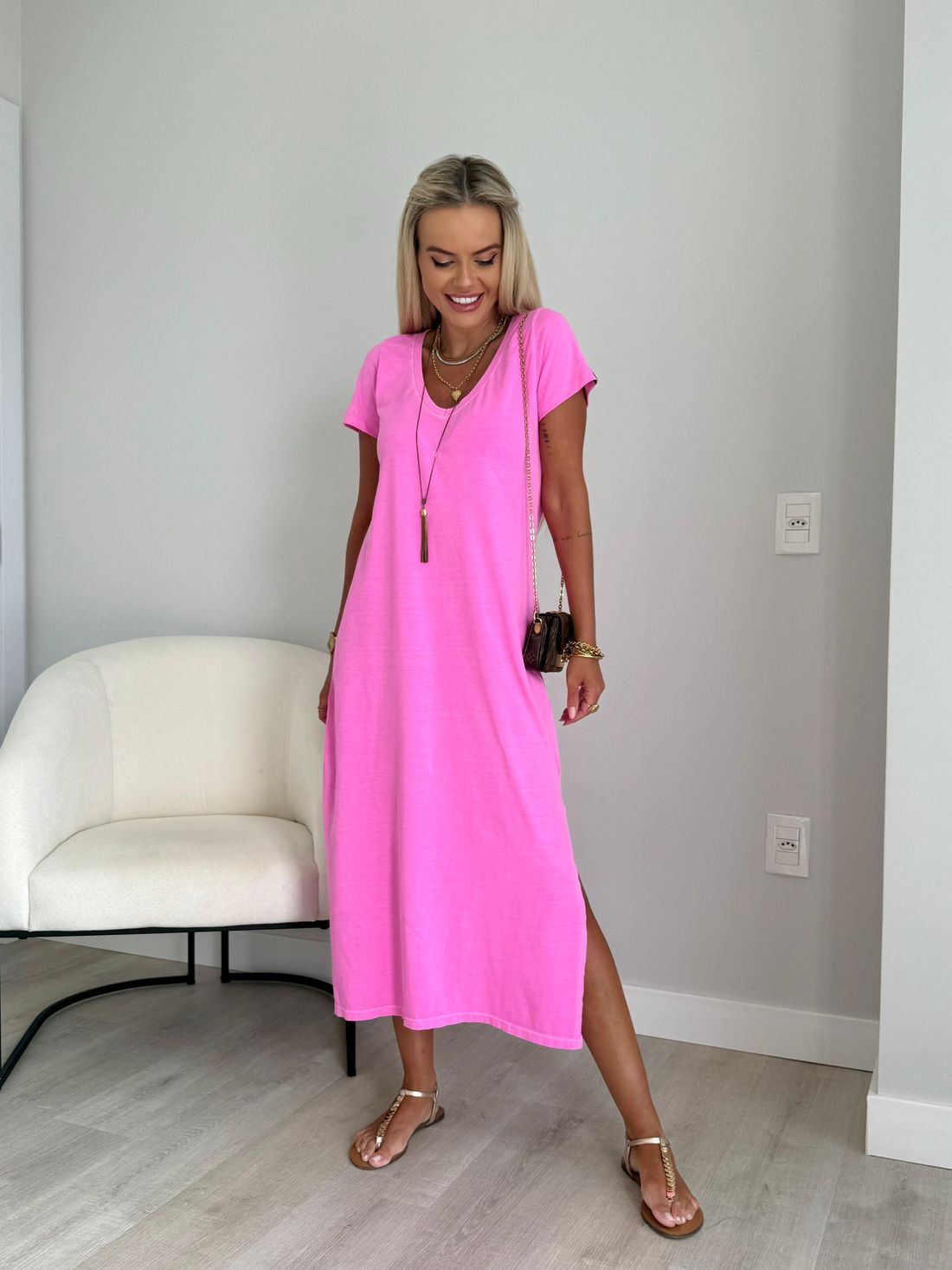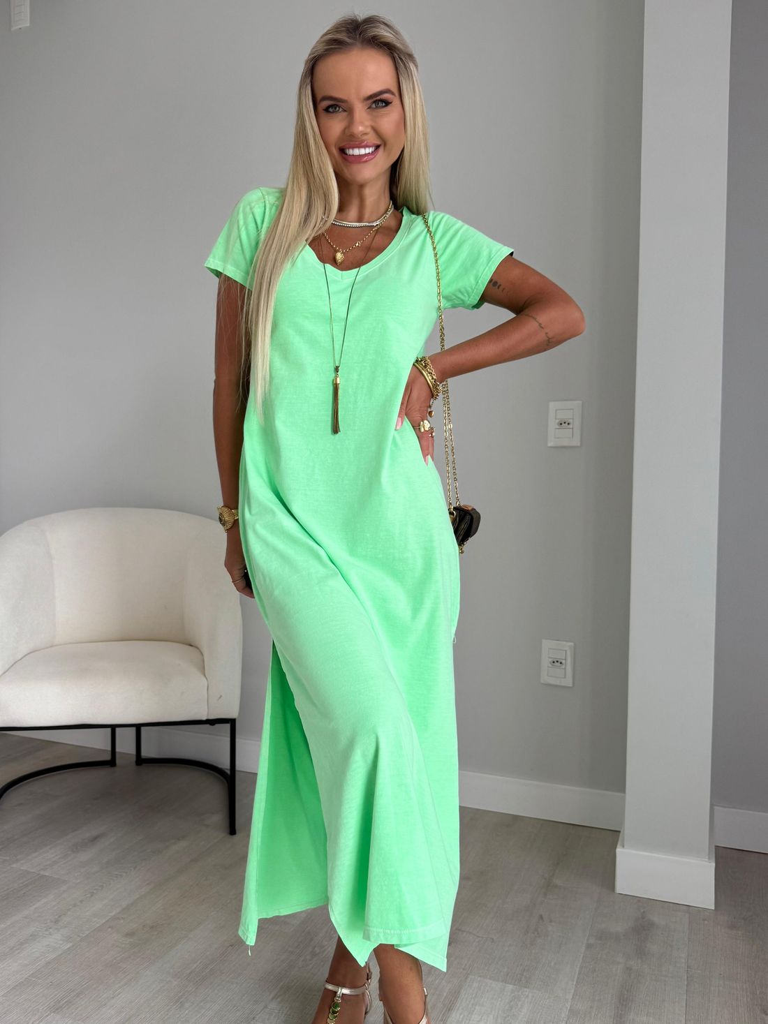 O decote em V valoriza o colo de forma natural, enquanto as fendas laterais trazem movimento e leveza ao visual. A modelagem soltinha, aliada ao comprimento midi e às mangas curtas, garante um caimento confortável e descomplicado.