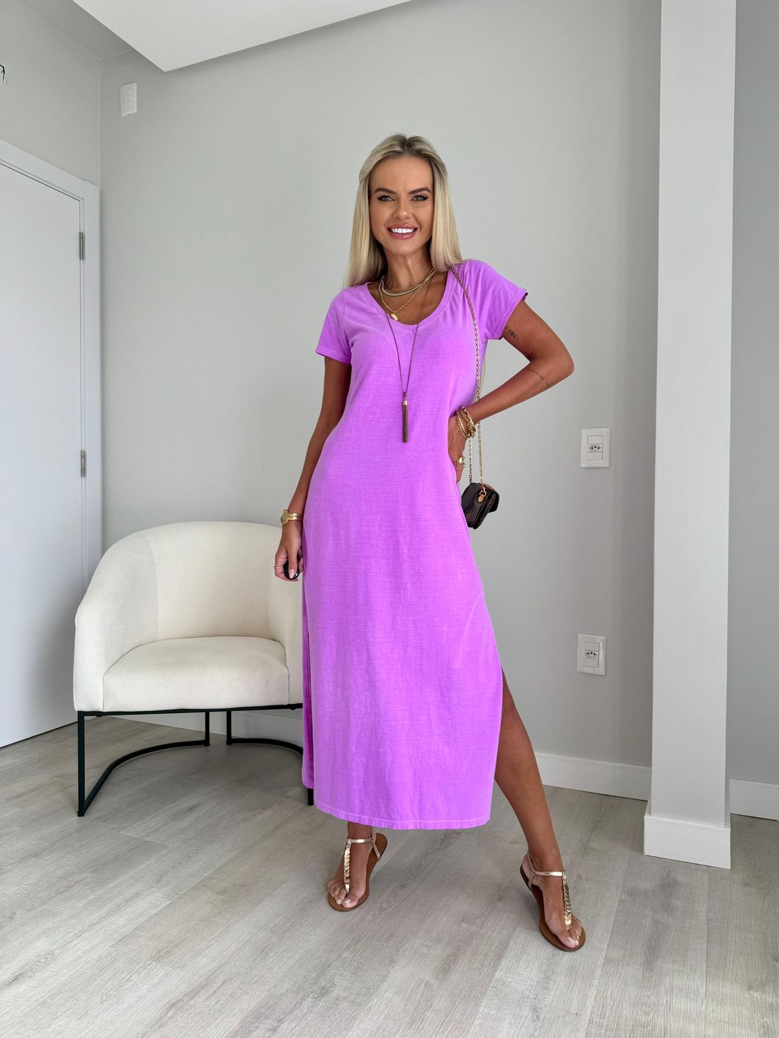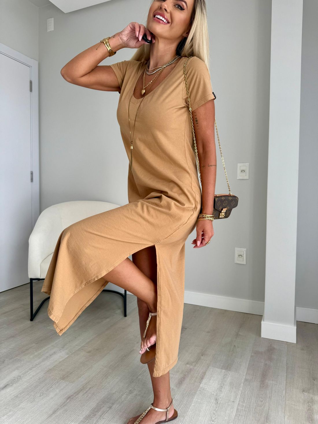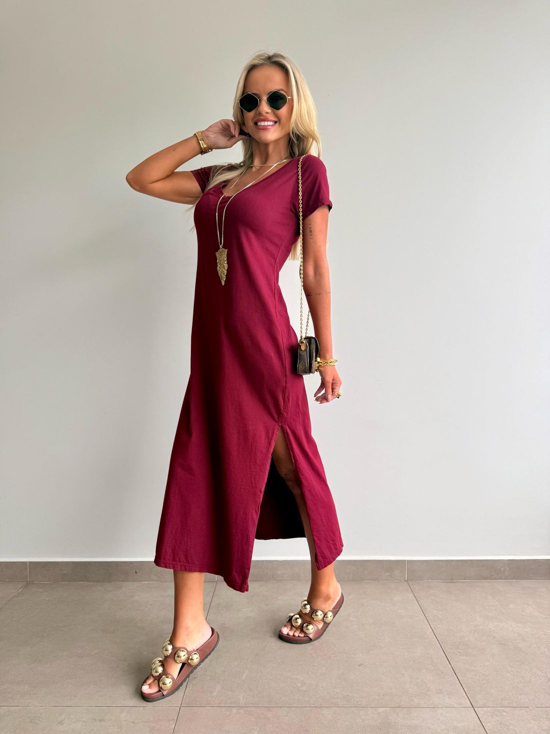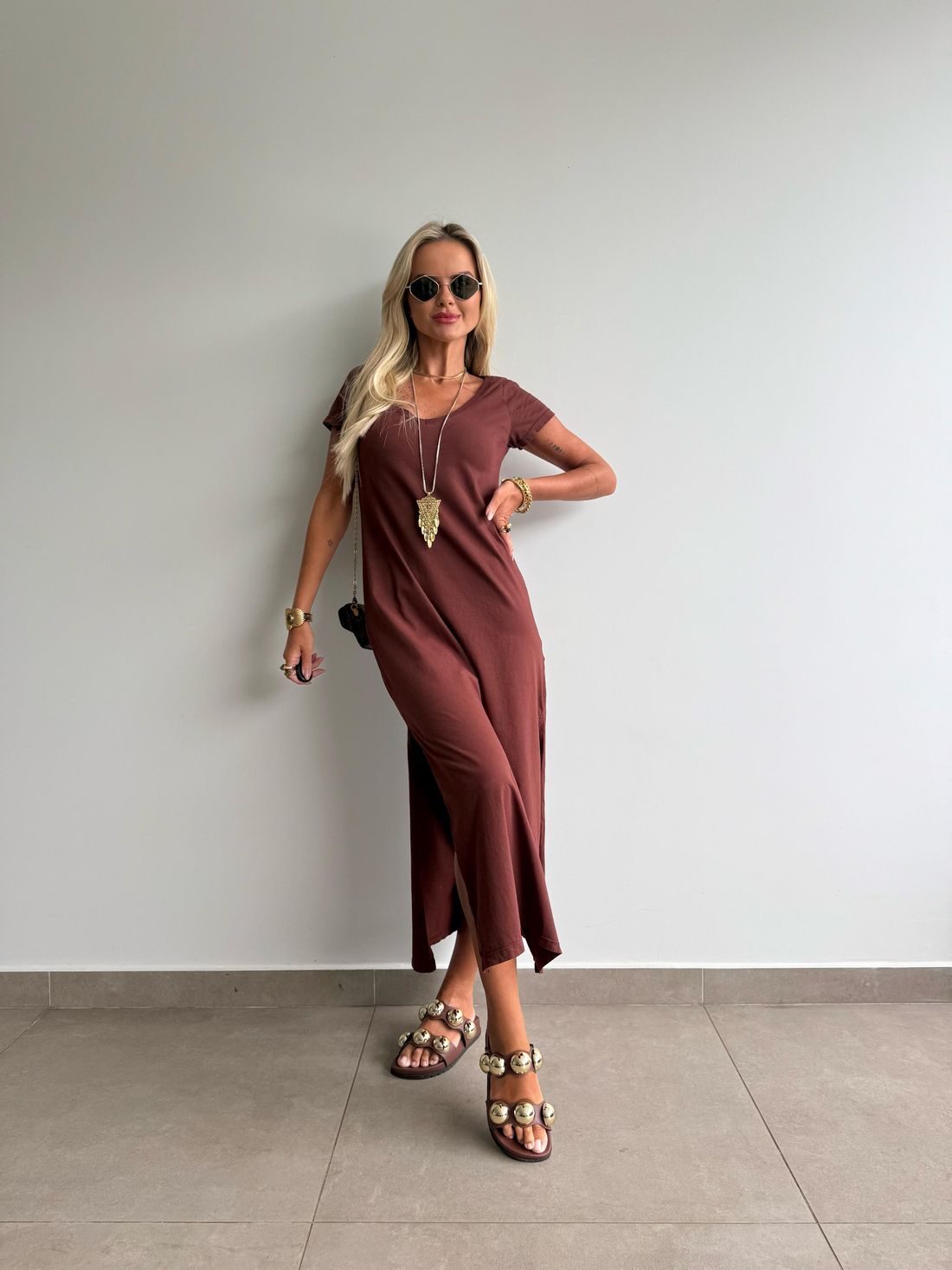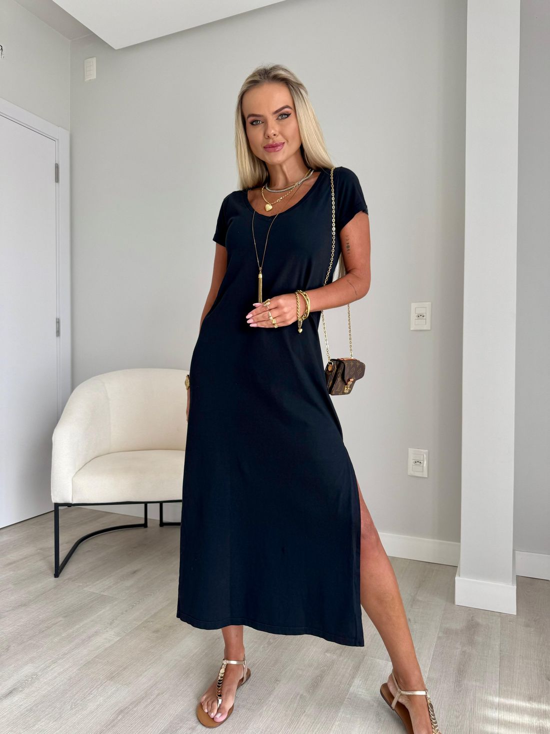 O decote em V valoriza o colo de forma natural, enquanto as fendas laterais trazem movimento e leveza ao visual. A modelagem soltinha, aliada ao comprimento midi e às mangas curtas, garante um caimento confortável e descomplicado.