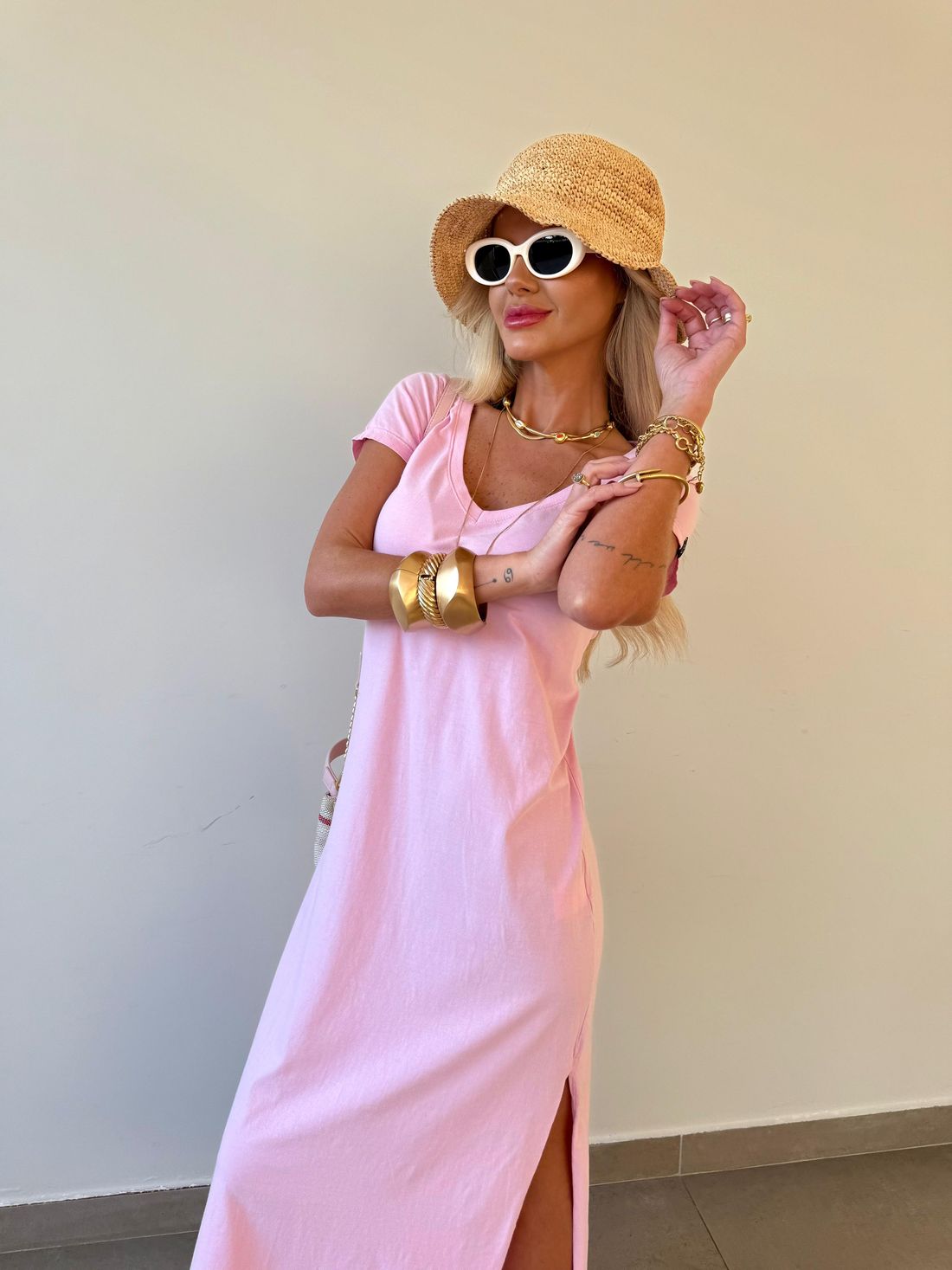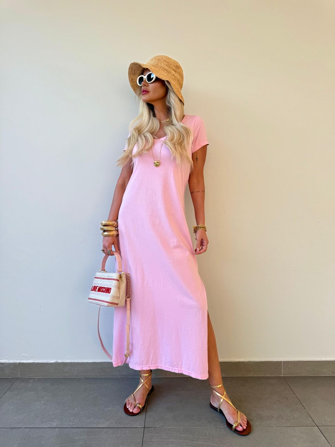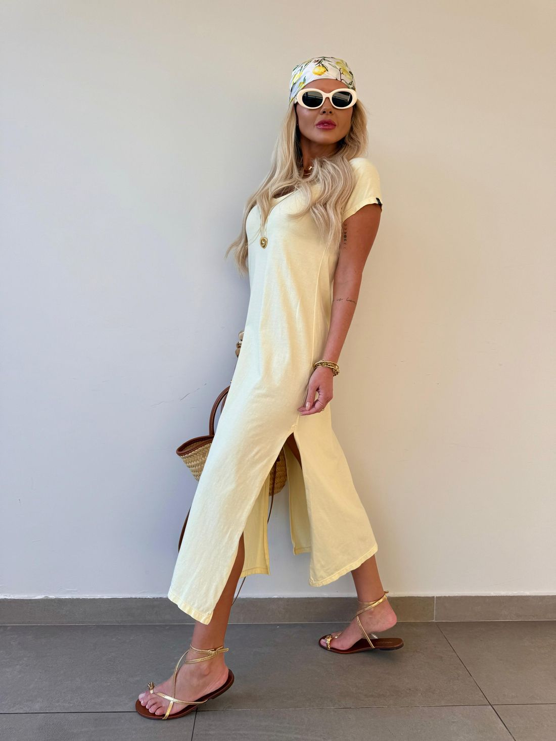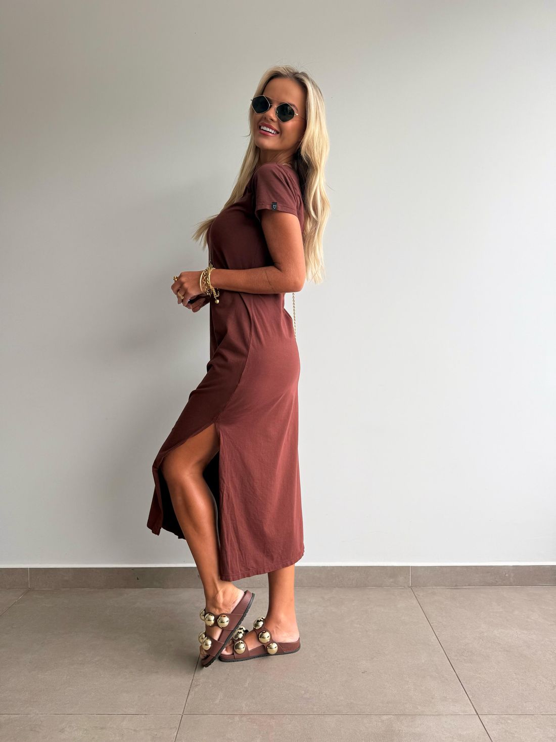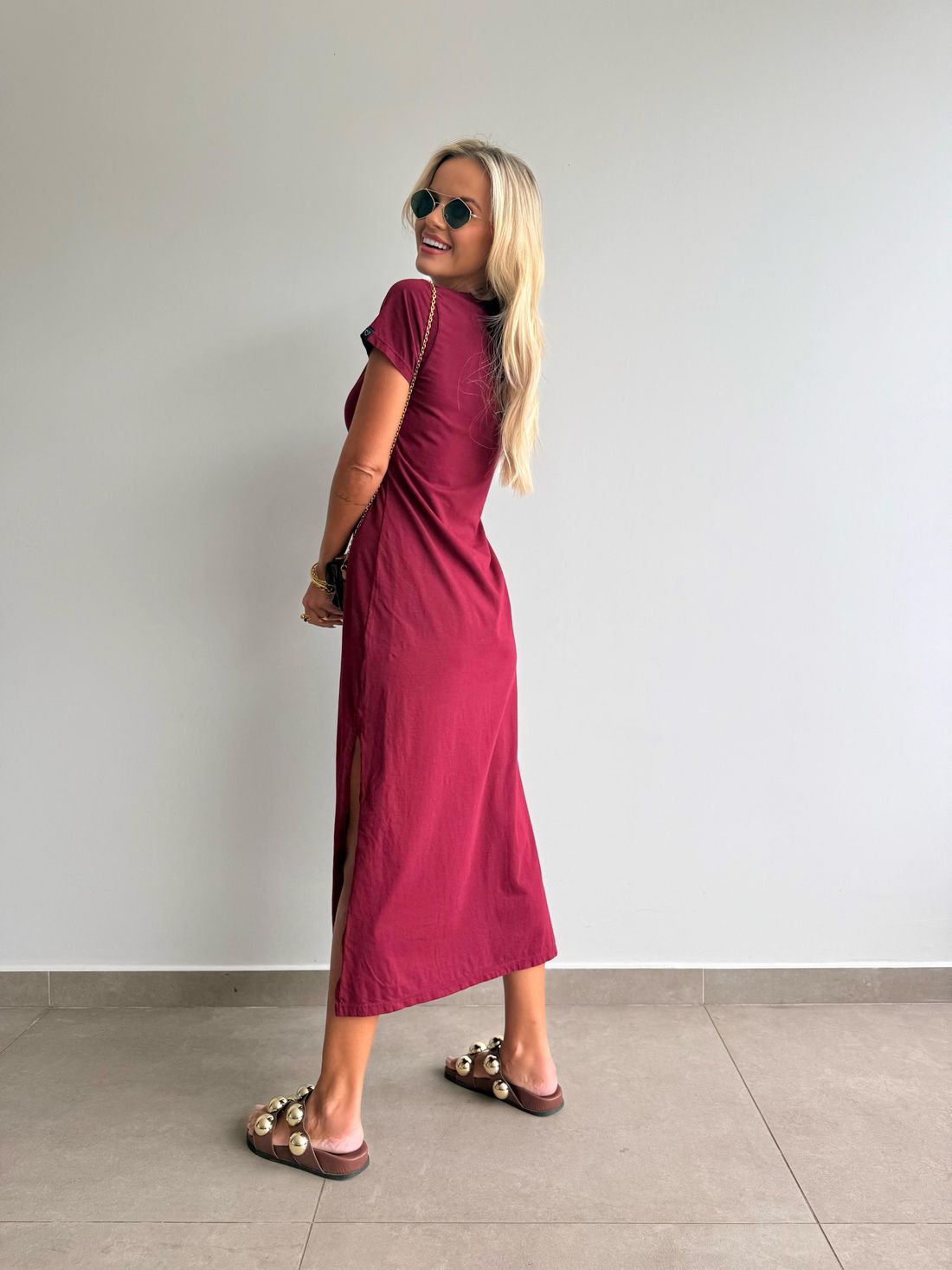 O decote em V valoriza o colo de forma natural, enquanto as fendas laterais trazem movimento e leveza ao visual. A modelagem soltinha, aliada ao comprimento midi e às mangas curtas, garante um caimento confortável e descomplicado.