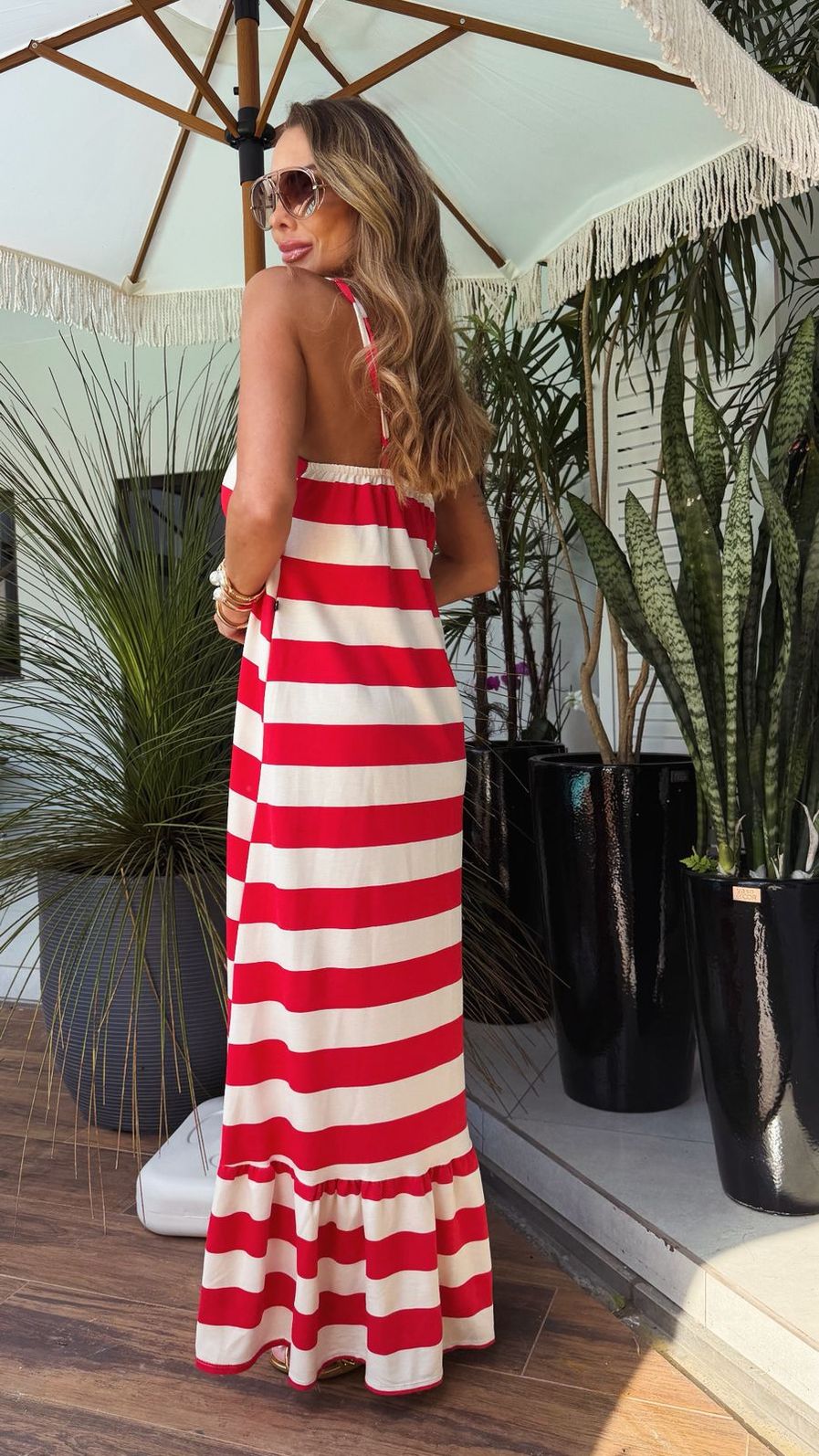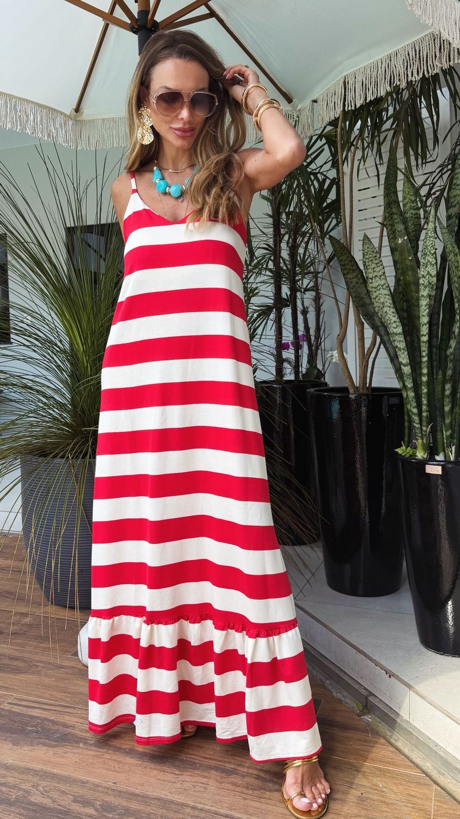 Confeccionado em tecido leve e fluido, o Pepi possui alças finas e decote delicado, valorizando o colo de forma feminina e elegante. Sua modelagem ampla e reta garante um caimento impecável, enquanto o comprimento longo com babado na barra adiciona movimento e charme à peça. As listras horizontais em vermelho e off-white criam um visual fresh, alegre e extremamente estiloso — perfeito para dias de sol.