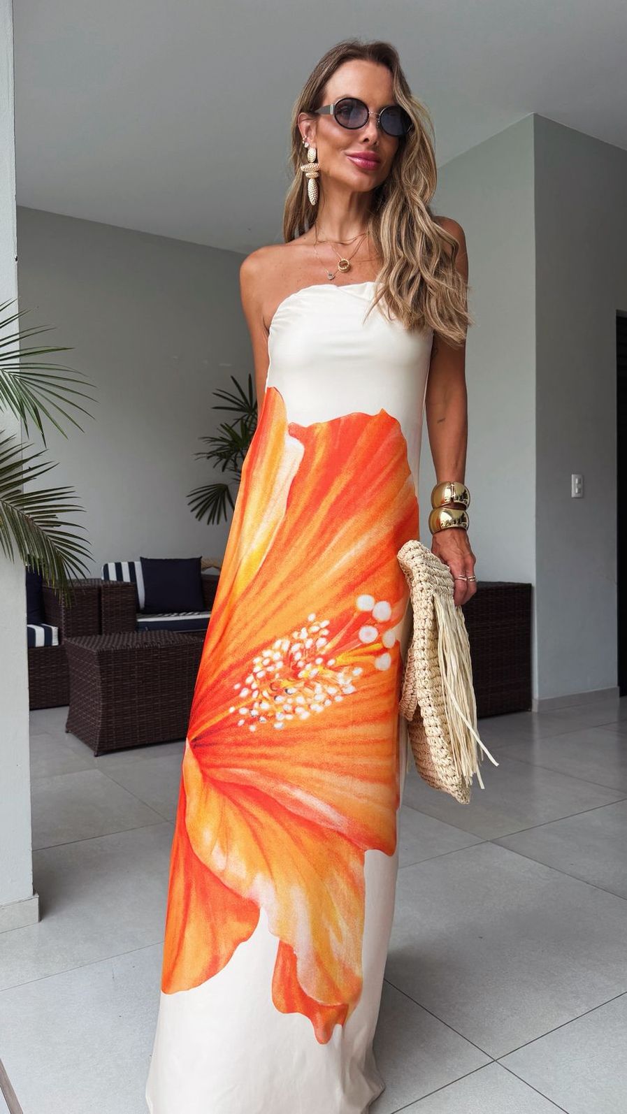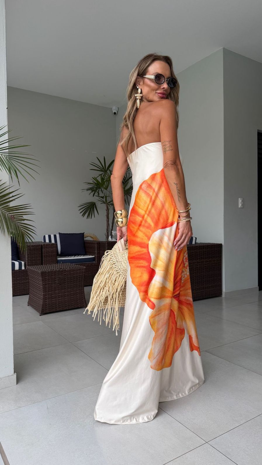 Confeccionado em tecido leve e fluido, o modelo se destaca pelo decote tomara que caia, que valoriza o colo com delicadeza, e pela modelagem longa de caimento solto, que alonga a silhueta e garante movimento ao caminhar. O grande diferencial fica por conta da estampa floral maxi em tons vibrantes de laranja, aplicada sobre o fundo claro, trazendo um ar artístico, solar e sofisticado à peça.