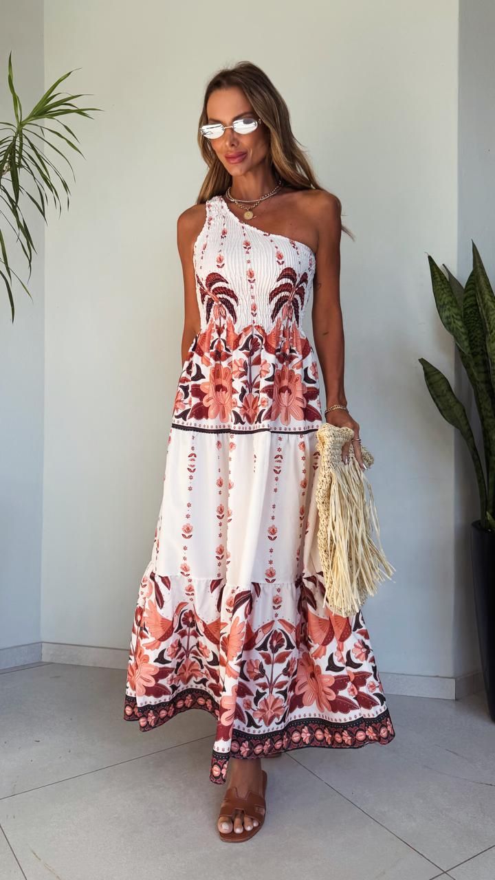 Confeccionado em tecido leve e confortável, o modelo se destaca pela estampa exclusiva em branco com desenhos em azul, que remetem ao estilo grego e trazem um visual atemporal e refinado. O decote de um ombro só adiciona um toque moderno e sensual na medida certa, enquanto o elástico na cintura valoriza a silhueta com conforto e caimento perfeito. A saia longa e fluida, com barrado estampado, garante movimento, leveza e um visual impecável para diversas ocasiões.